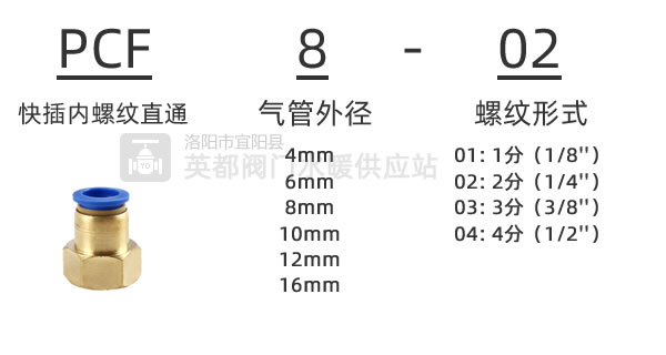PCF氣動(dòng)快插螺紋直通,一頭為快插接頭,用于連接氣管,另一頭為內(nèi)絲螺紋接頭,用于連接設(shè)備、控制閥、氣缸等。